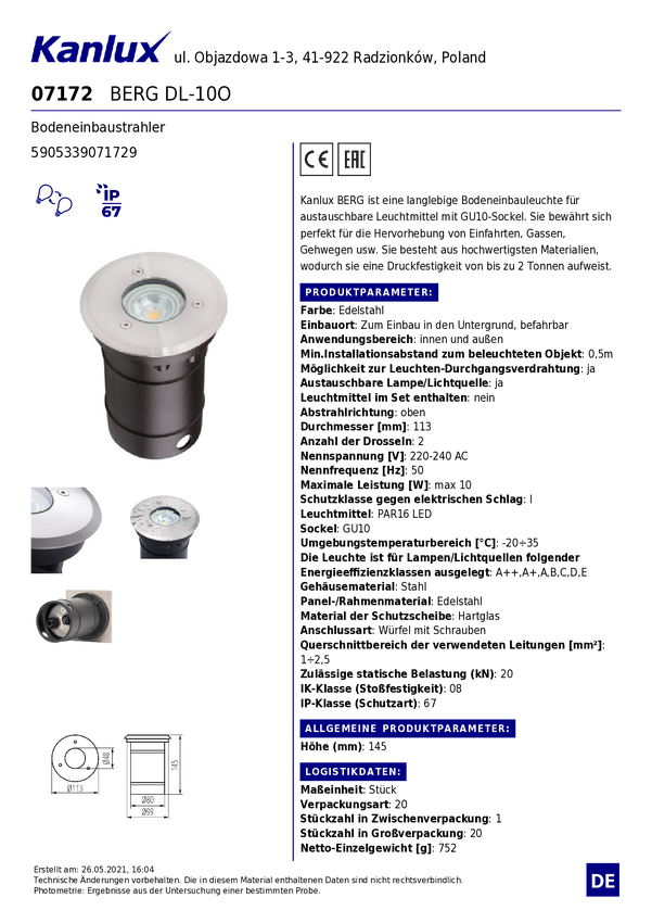 Lampa podłogowa do zabudowy Kanlux BERG DL-10O 7172 IP67