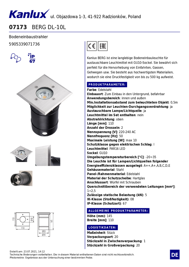 Lampa podłogowa do zabudowy Kanlux BERG DL-10L 7173 IP67