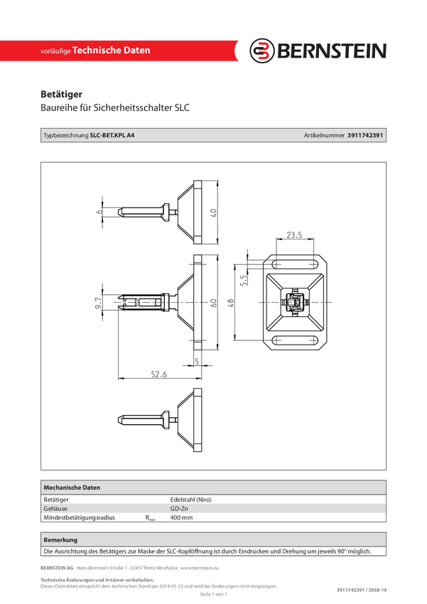 Bernstein 6018200022 SLC-F-024-10/20-R4-11 Wyłącznik bezpiecznikowy oddzielny siłownik zamek sprężynowy IP67 1 szt.