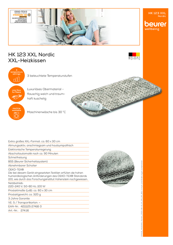 Poduszka elektryczna Beurer 27416 HK 123 XXL Nordic 100 W