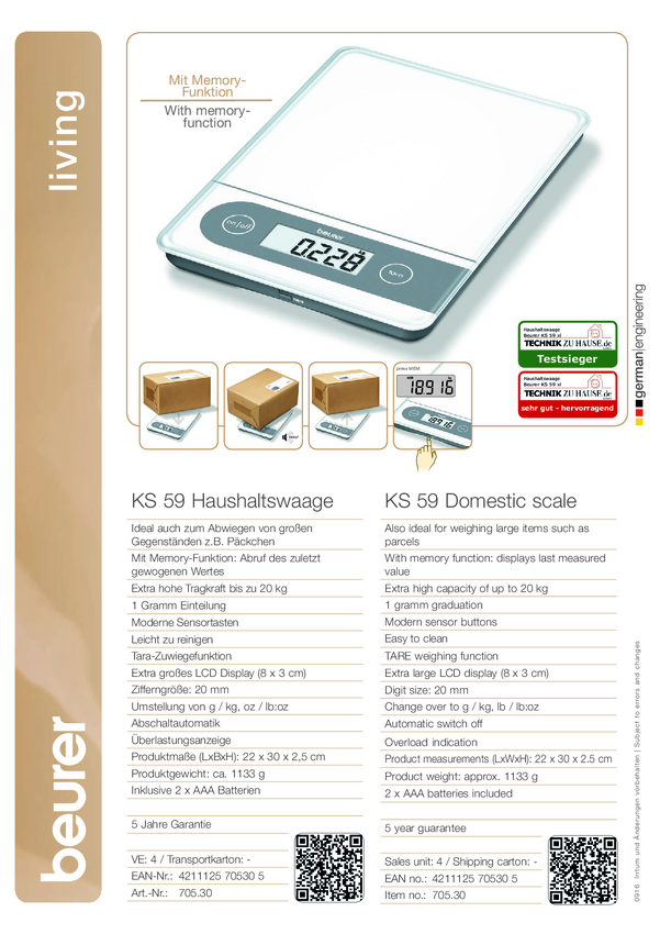 Beurer KS 59 Waga kuchenna cyfrowy Zakres pomiaru maks.=20 kg przeźroczysty 220 x 300 x 25