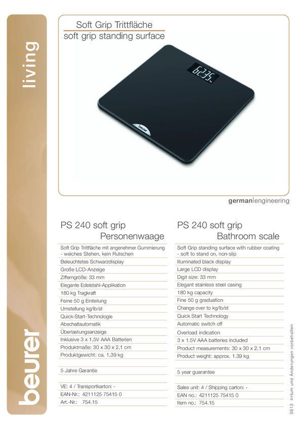 Beurer PS 240 Soft Grip Waga osobowa cyfrowy Zakres pomiaru maks.=180 kg czarny
