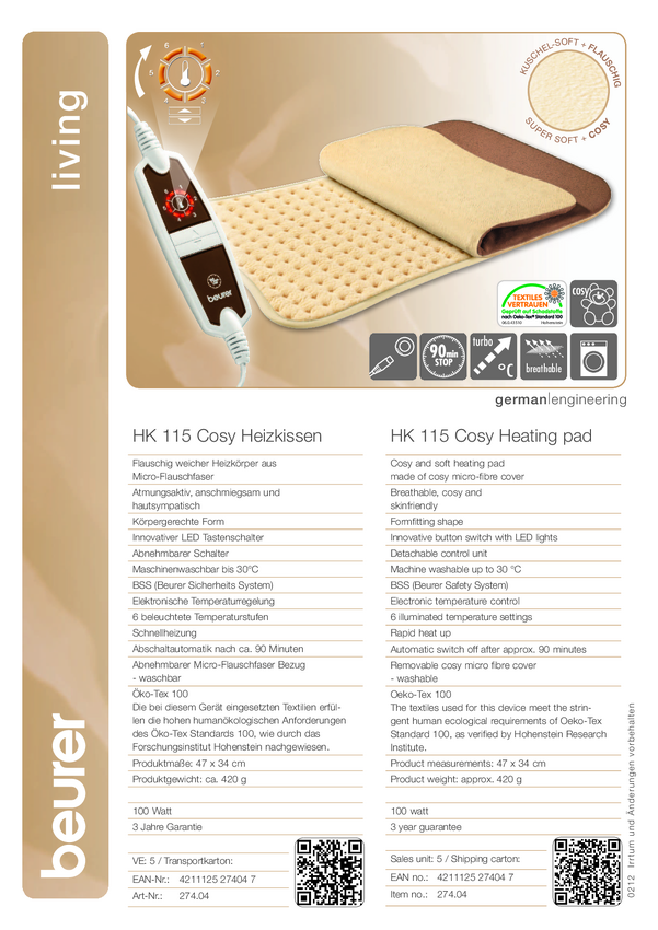 Poduszka elektryczna Beurer 27404 HK 115 Cosy 100 W