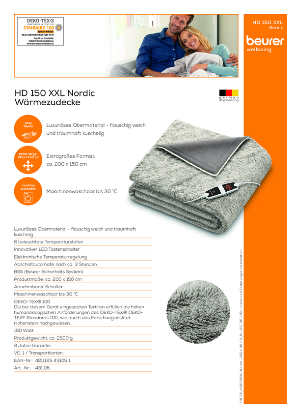 Ciepły koc Beurer 43105 HD 150 XXL Nordic Cosy 150 W