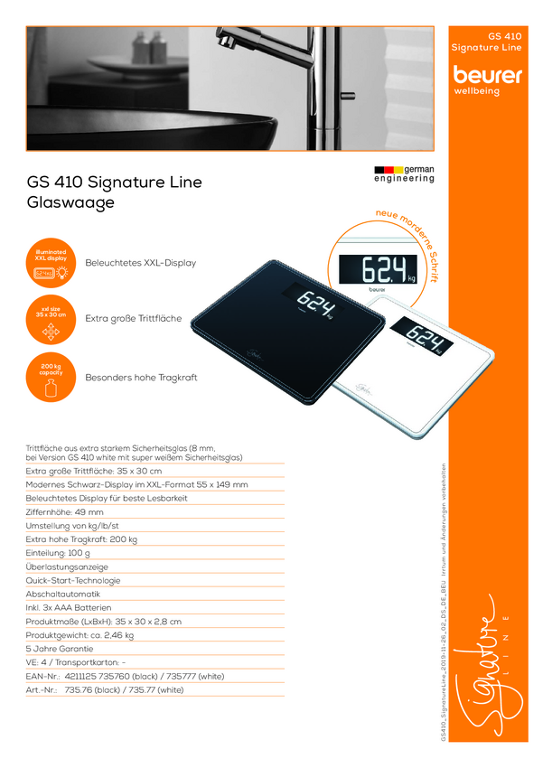 Beurer GS 410 Signature Line Waga osobowa cyfrowy Zakres pomiaru maks.=200 kg czarny