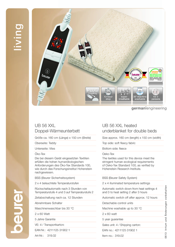 Wkład rozgrzewający do łóżka Beurer 31902 UB 56 Teddy Double 120 W