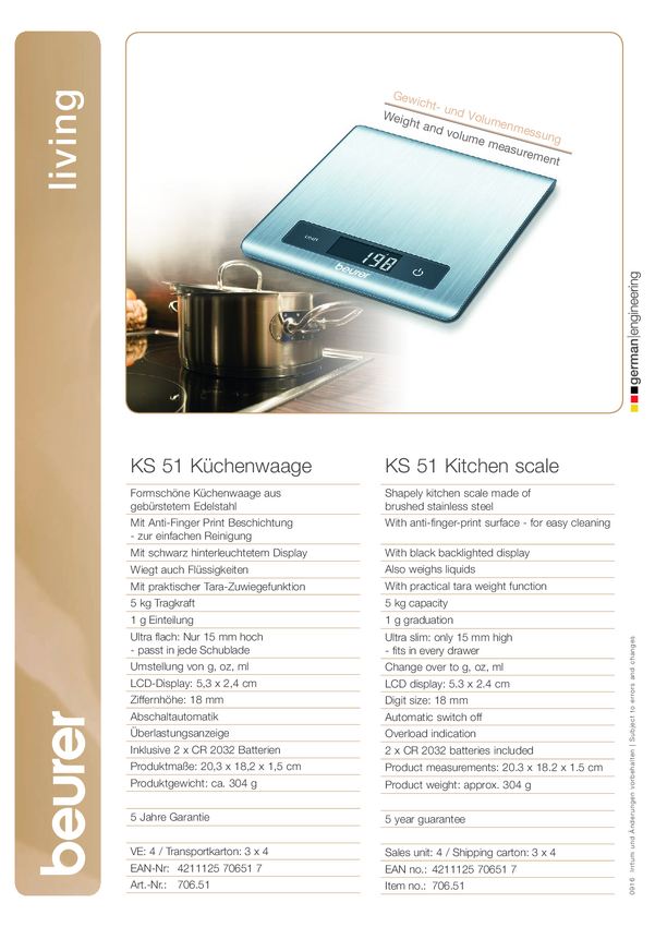 Beurer KS 51 Waga kuchenna cyfrowy Zakres pomiaru maks.=5 kg stali szlachetnej 203 x 182 x 15