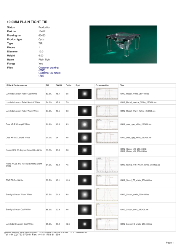 Soczewka Carclo 10412, bezbarwna, średnia, do diod Cree serii XP, XT-E,śr:10mm, wys:6mm, FWHM(XP-E):16,5° FWHM(XP-G):24° FWHM(XP-C):10,7°