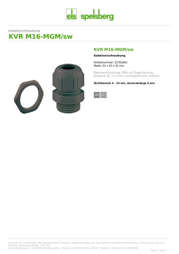 Spelsberg 22701601 Dławnica kablowa odporna na promieniowanie UV, bezhalogenowa poliamid czarny 1 szt.
