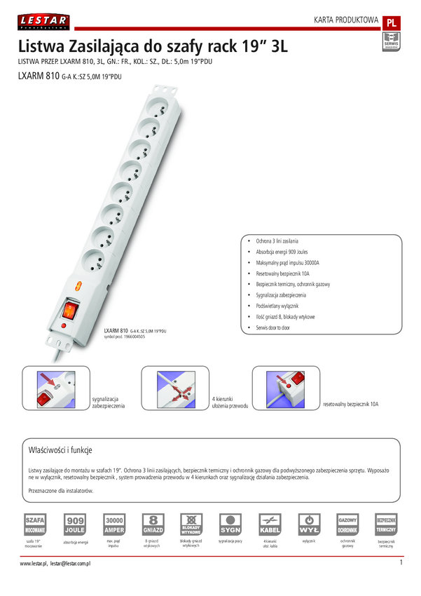 Listwa zasilająca 8 gniazd wyłącznik bezpiecznik przewód 5m