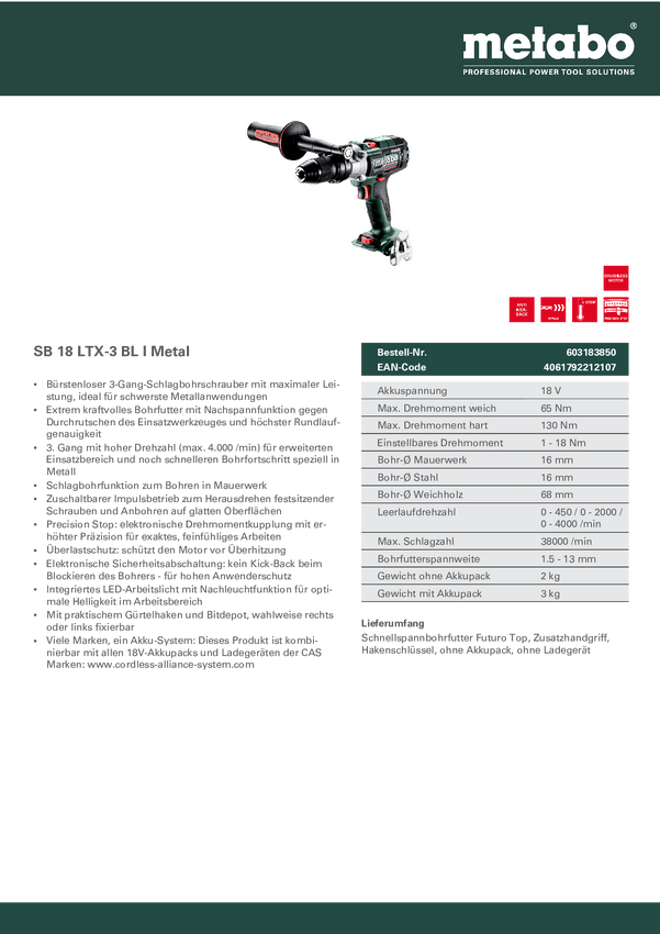 Wkrętarka udarowa akumulatorowa Metabo SB 18 LTX-3 BL I Metal bezszczotkowy, bez akumulatora, bez ładowarki