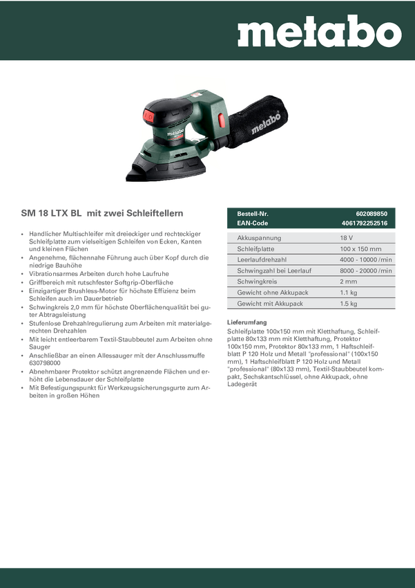 Metabo SM 18 LTX BL 602089850 Szlifierka uniwersalna bezszczotkowy, bez akumulatora, bez ładowarki 18 V 100 x 150 mm Ilo