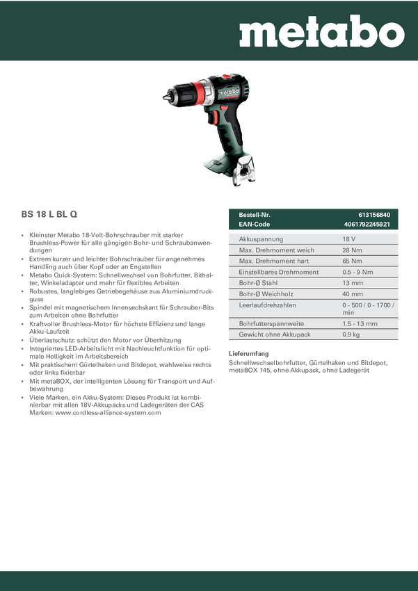 Wiertarko-wkrętarka akumulatorowa Metabo BS 18 L BL Q 613156840 18 V bezszczotkowy, zaw. walizkę, bez akumulatora, bez ł