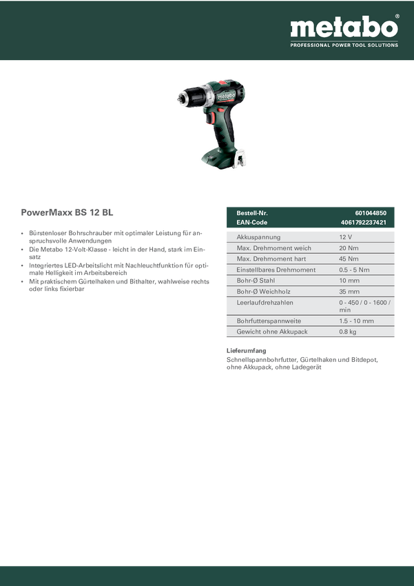 Wiertarko-wkrętarka akumulatorowa Metabo PowerMaxx BS 12 BL 601044850 12 V bezszczotkowy, bez akumulatora, bez ładowarki