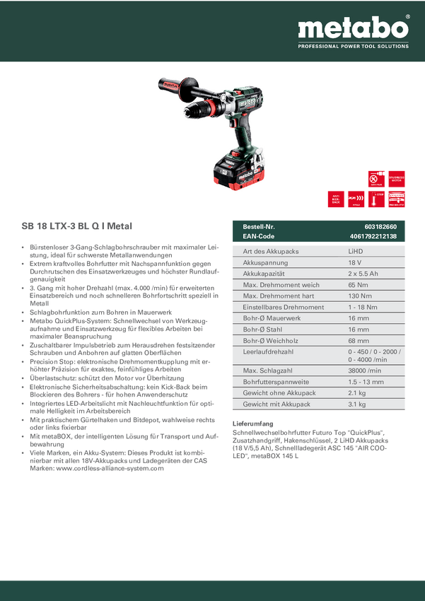 Wkrętarka udarowa akumulatorowa Metabo SB 18 LTX-3 BL Q I Metal bezszczotkowy, zaw. 2 akumulatory, zaw. walizkę, zaw. ła