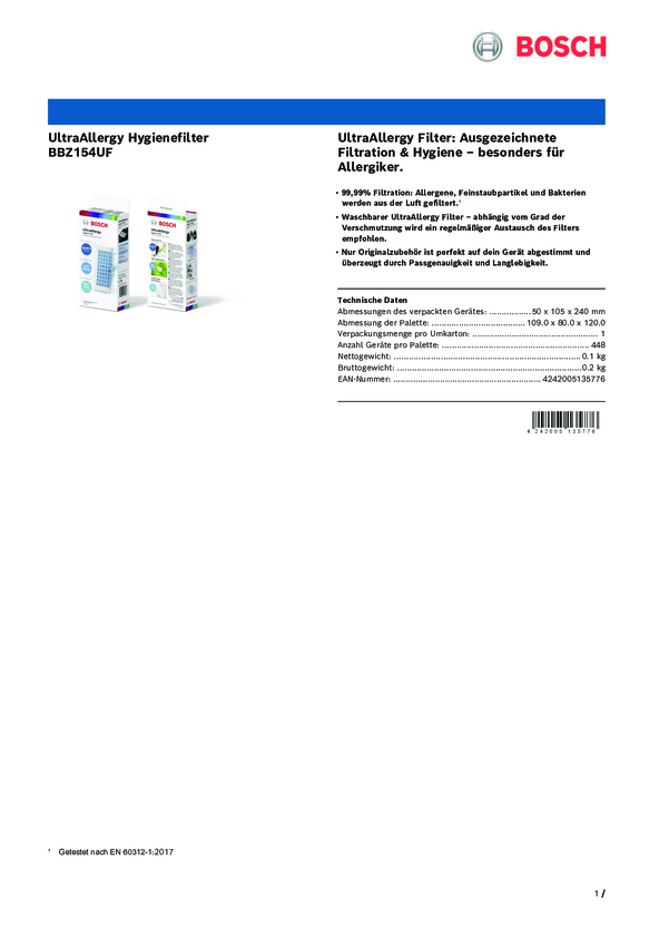 Bosch UltraAllergy Hygienefilter für Bosch Staubsauger BGL8,BGB8,BGL7BGB7,BSGL5,BGL5S BBZ154UF