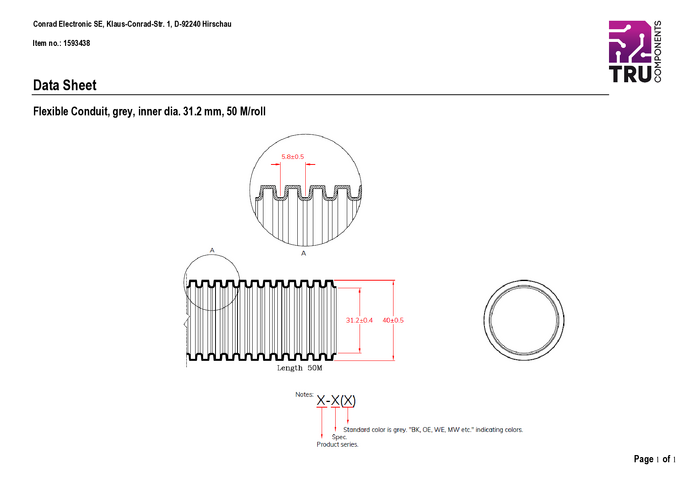 Wąż TRU COMPONENTS TC-BGR40P203 1593438, 40 mm, 1 m