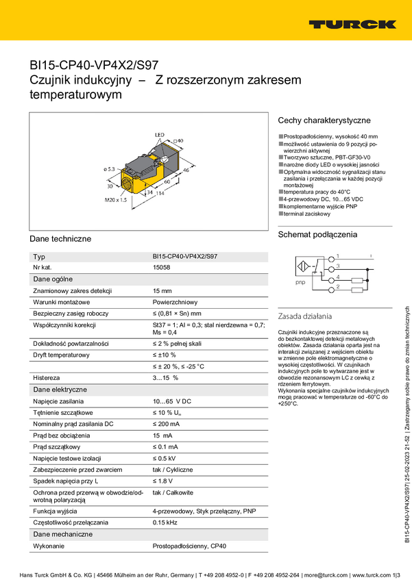 Czujnik indukcyjny Turck BI15-CP40-VP4X2/S97, 10 - 65 V, 1 szt.