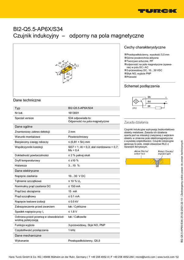 Czujnik indukcyjny Turck BI2-Q5,5-AP6X/S34, 10 - 30 V, 1 szt.