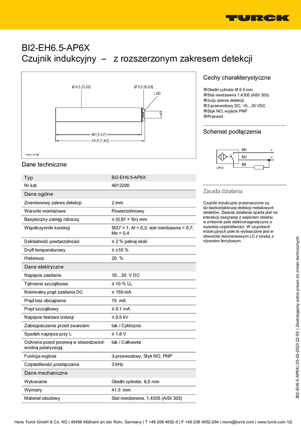 Turck Czujnik indukcyjny podtynkowy PNP, Zamykający BI2-EH6,5-AP6X