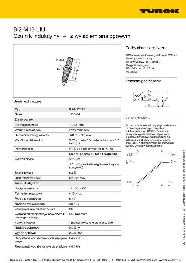 Czujnik indukcyjny Turck BI2-M12-LIU, 15 - 30 V, IP67, 1 szt.