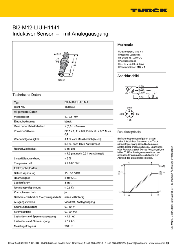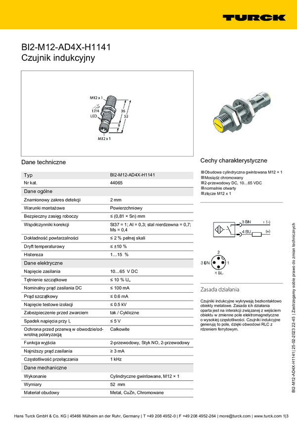 Czujnik indukcyjny Turck BI2-M12-AD4X-H1141, 10 - 65 V, 1 szt.