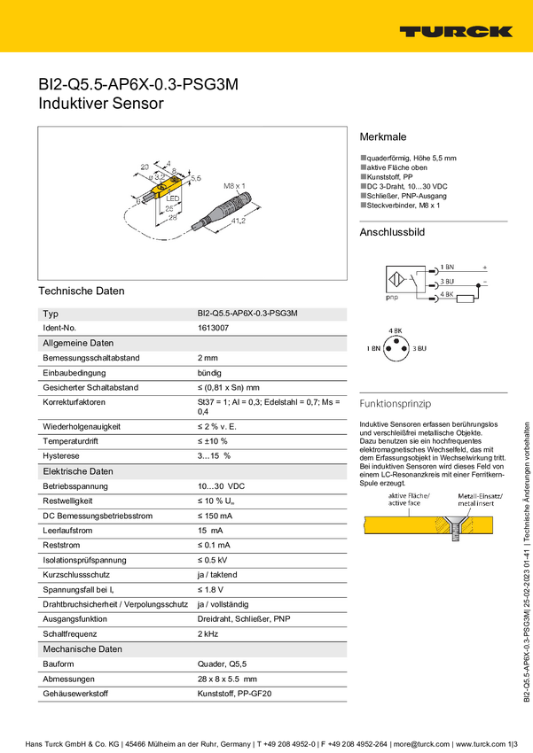 Czujnik indukcyjny Turck BI2-Q5,5-AP6X-0,3-PSG3M, 10 - 30 V, 1 szt.