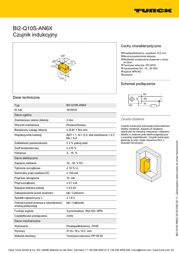 Turck Czujnik indukcyjny podtynkowy PNP, Zamykający BI2-Q10S-AP6X