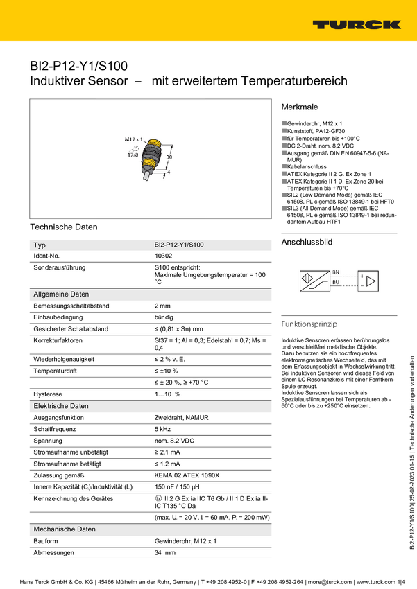 Czujnik indukcyjny Turck BI2-P12-Y1/S100, 1 szt.