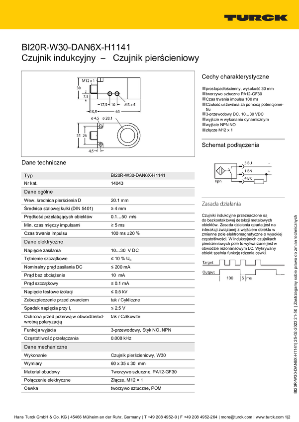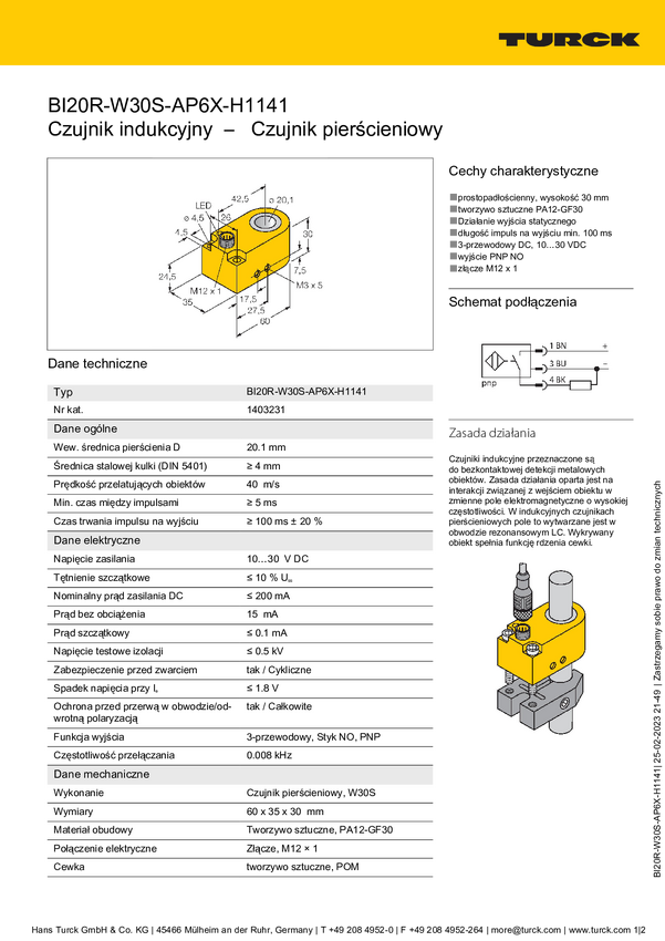 Turck Czujnik indukcyjny PNP, Zamykający BI20R-W30S-AP6X-H1141
