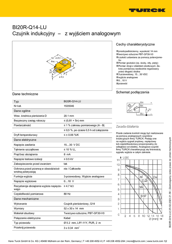 Czujnik indukcyjny Turck BI20R-Q14-LU, 15 - 30 V, IP67, 1 szt.