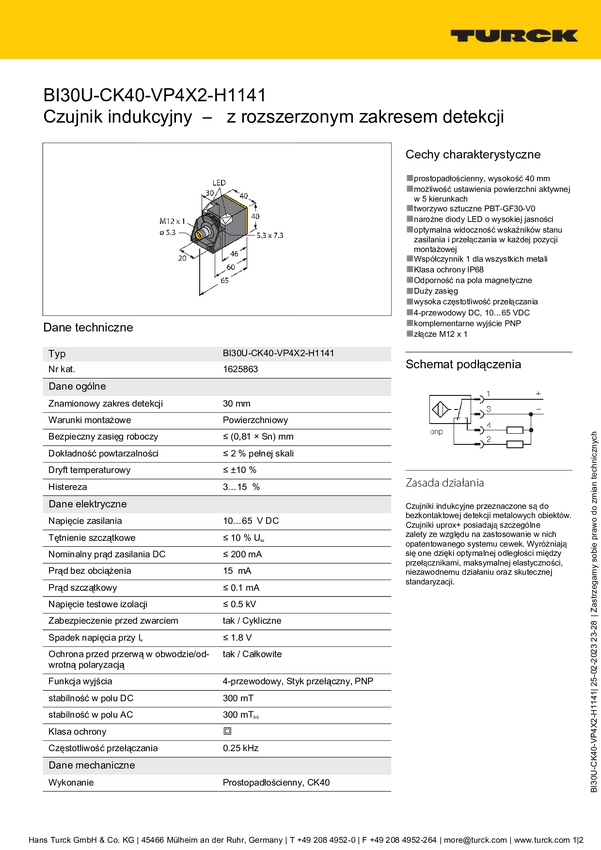 Turck Czujnik indukcyjny podtynkowy PNP, Przełącznik BI30U-CK40-VP4X2-H1141