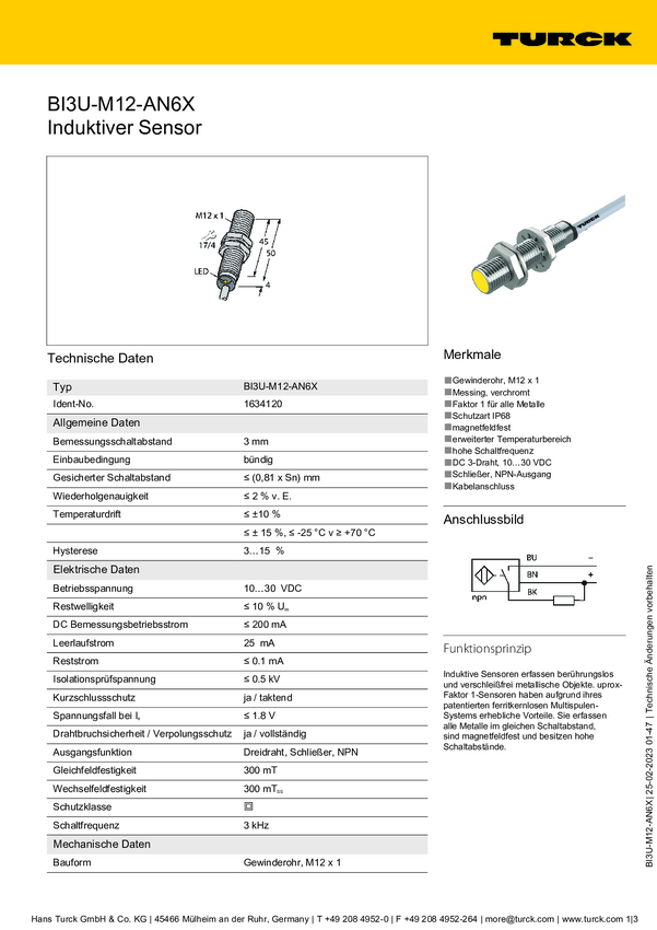 Czujnik indukcyjny Turck BI3U-M12-AN6X, 10 - 30 V, 1 szt.