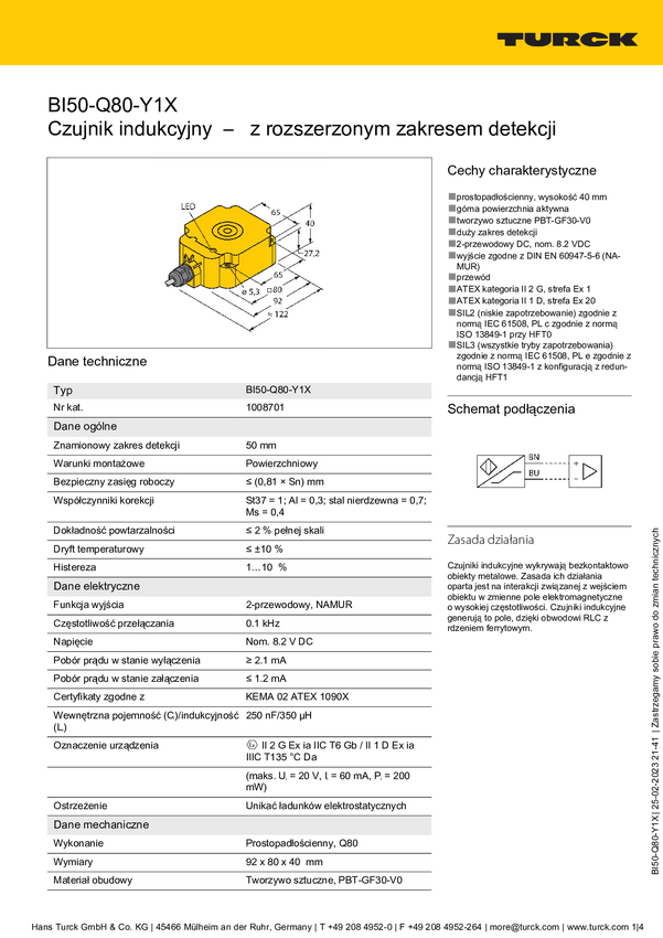 Czujnik indukcyjny Turck BI50-Q80-Y1X, 1 szt.