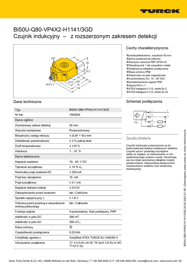 Czujnik indukcyjny Turck BI50U-Q80-VP4X2-H1141/3GD, 10 - 65 V, 1 szt.