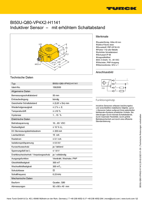 Turck Czujnik indukcyjny podtynkowy PNP, Przełącznik BI50U-Q80-VP4X2-H1141