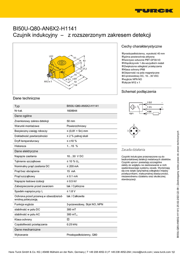 Czujnik indukcyjny Turck BI50U-Q80-AN6X2-H1141, 10 - 30 V, 1 szt.