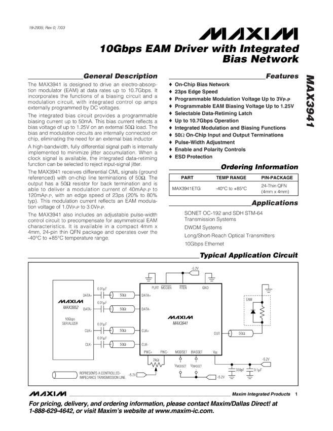 MAX3941 10Gbps EAM Driver with Integrated Bias Network