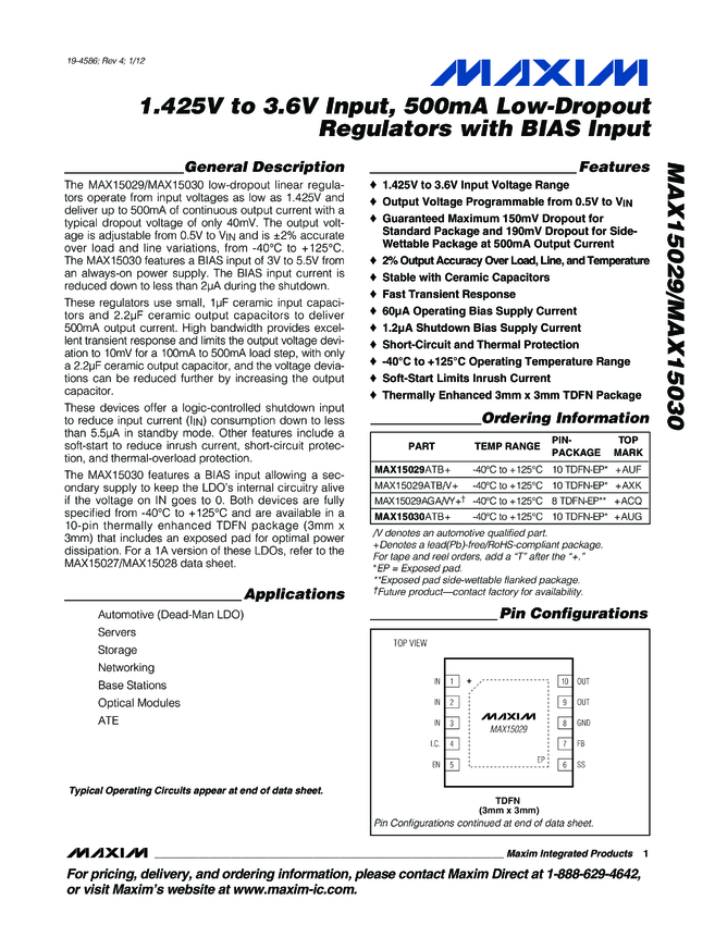 MAX15029, MAX15030 1.425V to 3.6V Input, 500mA Low-Dropout Regulators with BIAS Input