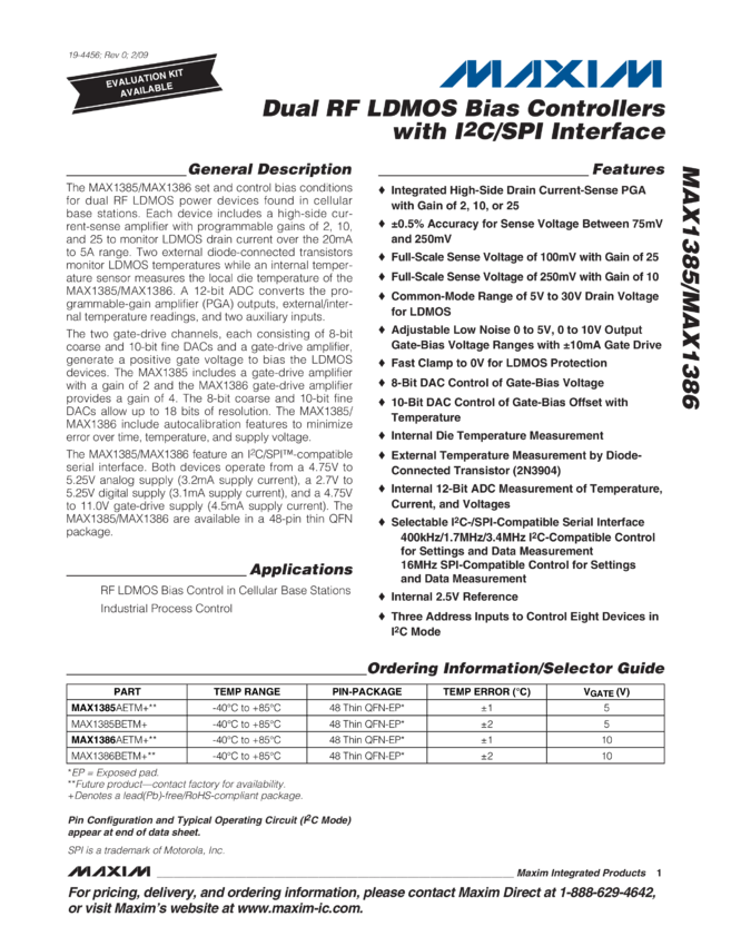 MAX1385, MAX1386 Dual RF LDMOS Bias Controllers with I²C/SPI Interface