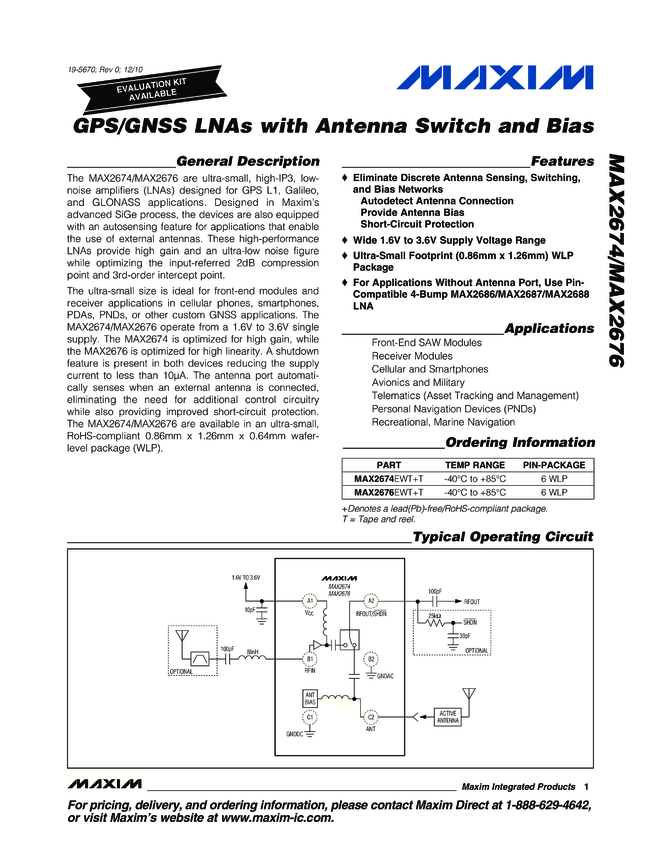 MAX2674, MAX2676 GPS/GNSS LNAs with Antenna Switch and Bias