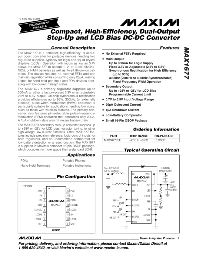 MAX1677 Compact, High-Efficiency, Dual-Output Step-Up and LCD Bias DC-DC Converter