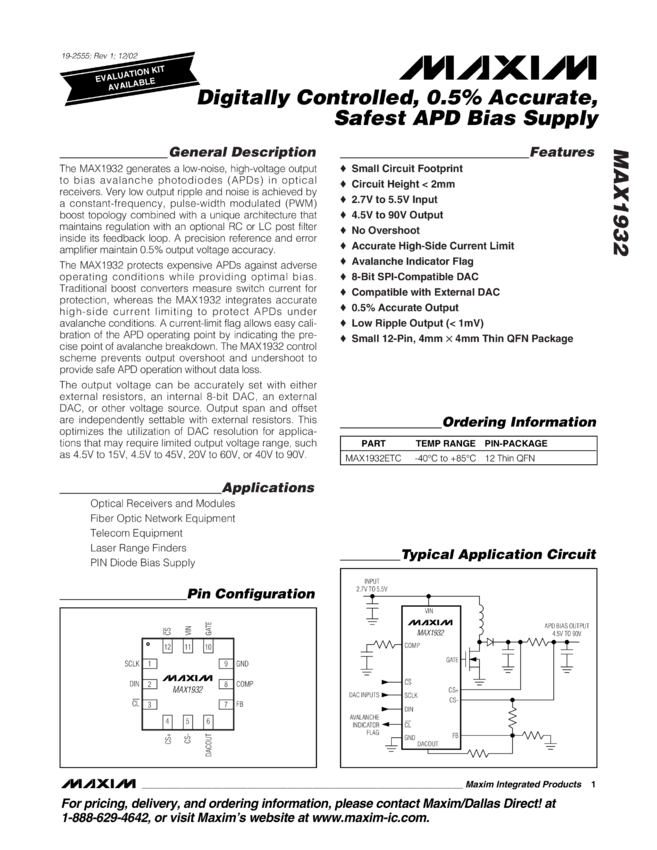 MAX1932 Digitally Controlled, 0.5% Accurate, Safest APD Bias Supply
