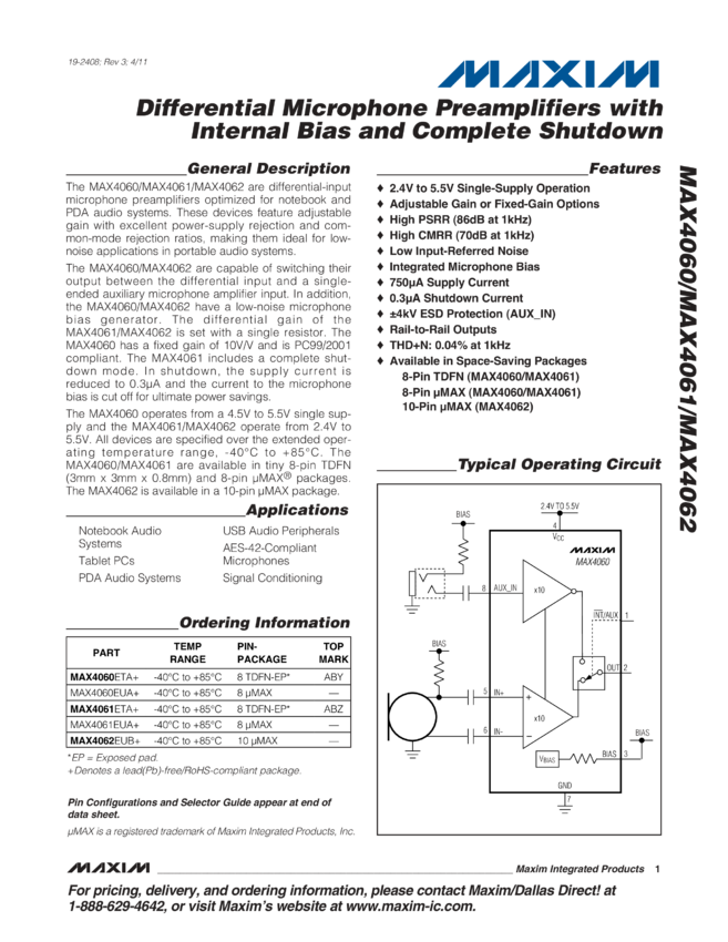 MAX4060, MAX4061, MAX4062 Differential Microphone Preamplifiers with Internal Bias and Complete Shutdown