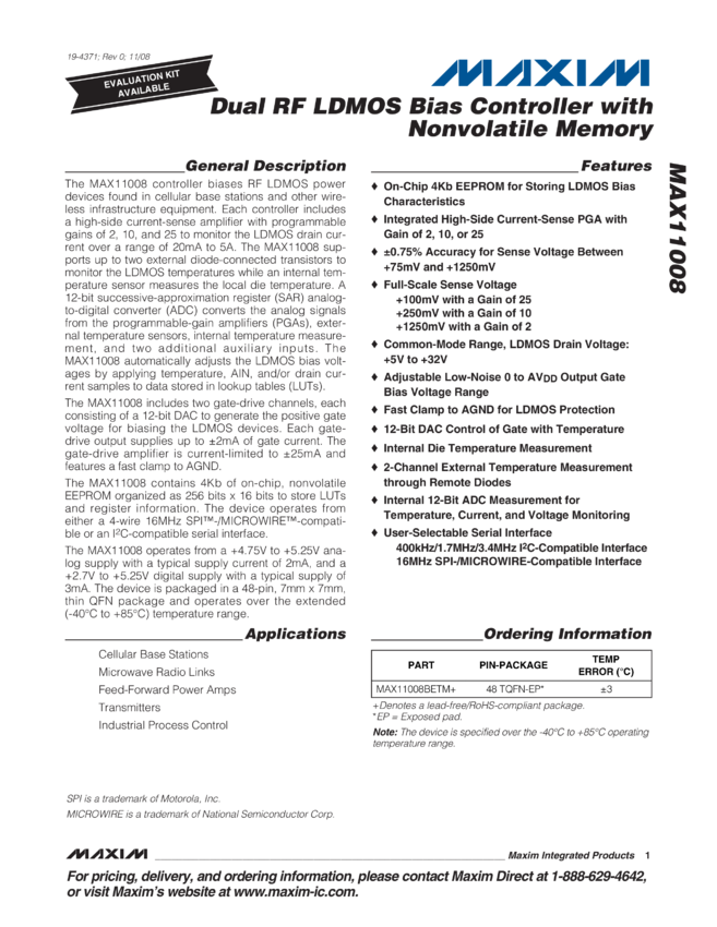 MAX11008 Dual RF LDMOS Bias Controller with Nonvolatile Memory