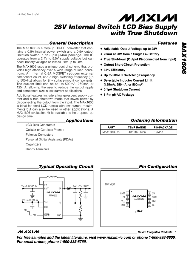 MAX1606 28V Internal Switch LCD Bias Supply with True Shutdown™