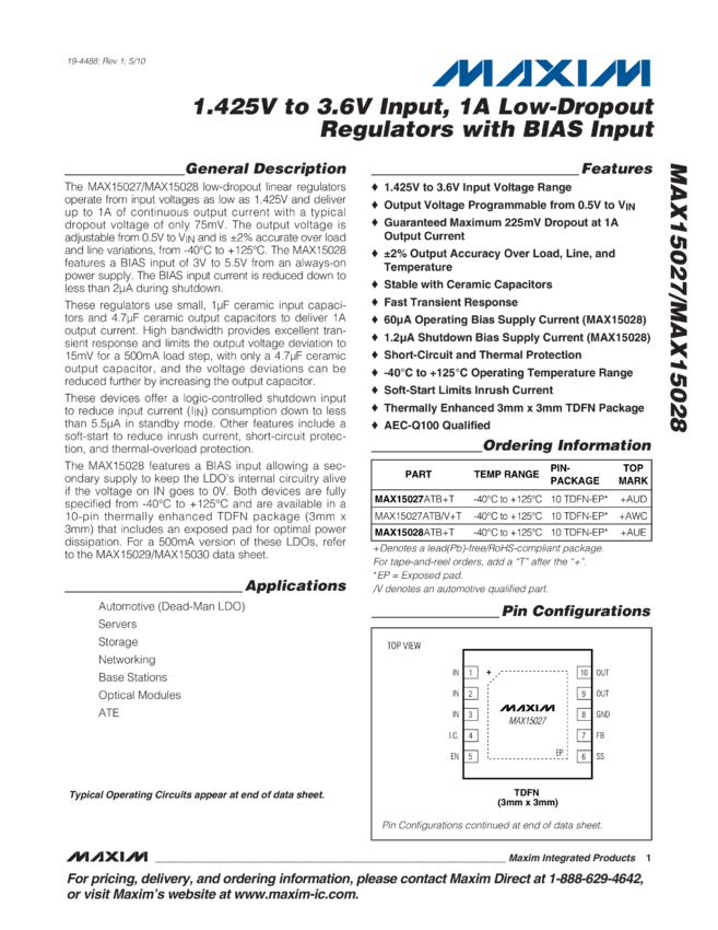MAX15027, MAX15028 1.425V to 3.6V Input, 1A Low-Dropout Regulators with BIAS Input