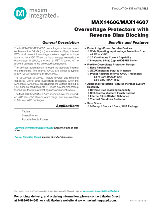 MAX14606, MAX14607 Overvoltage Protectors with Reverse Bias Blocking