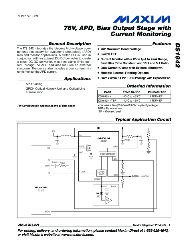 DS1842 76V, APD, Bias Output Stage with Current Monitoring