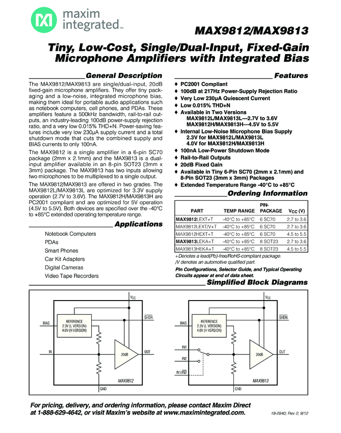MAX9812, MAX9813 Tiny, Low-Cost, Single/Dual-Input, Fixed-Gain Microphone Amplifiers with Integrated Bias